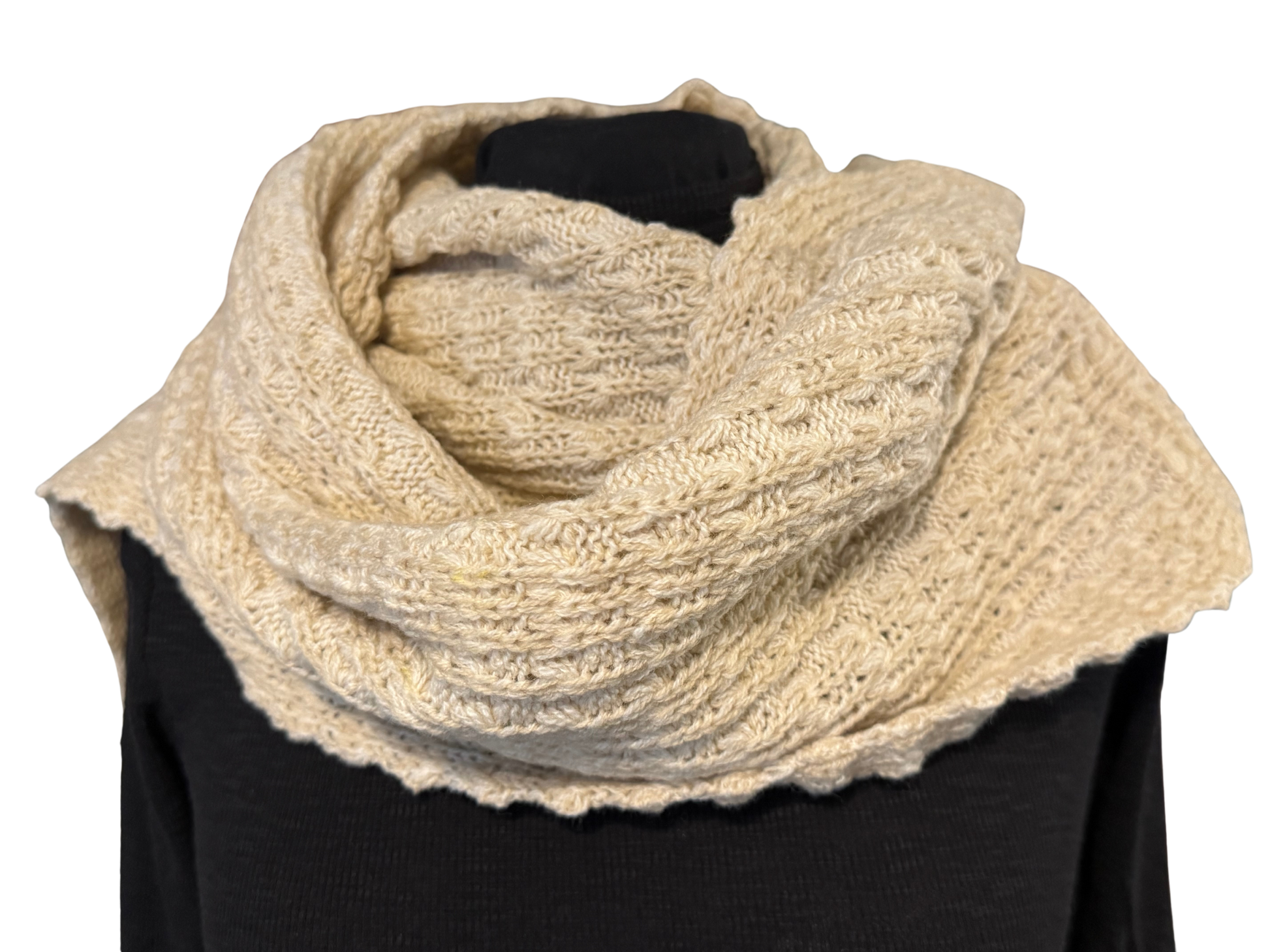 Crafted in soft, 100% merino lambswool spun in Britain, Bainin Ecru wraps easily for year-round wear — warm enough against crisp coastal breezes yet light enough for calm summer mornings.